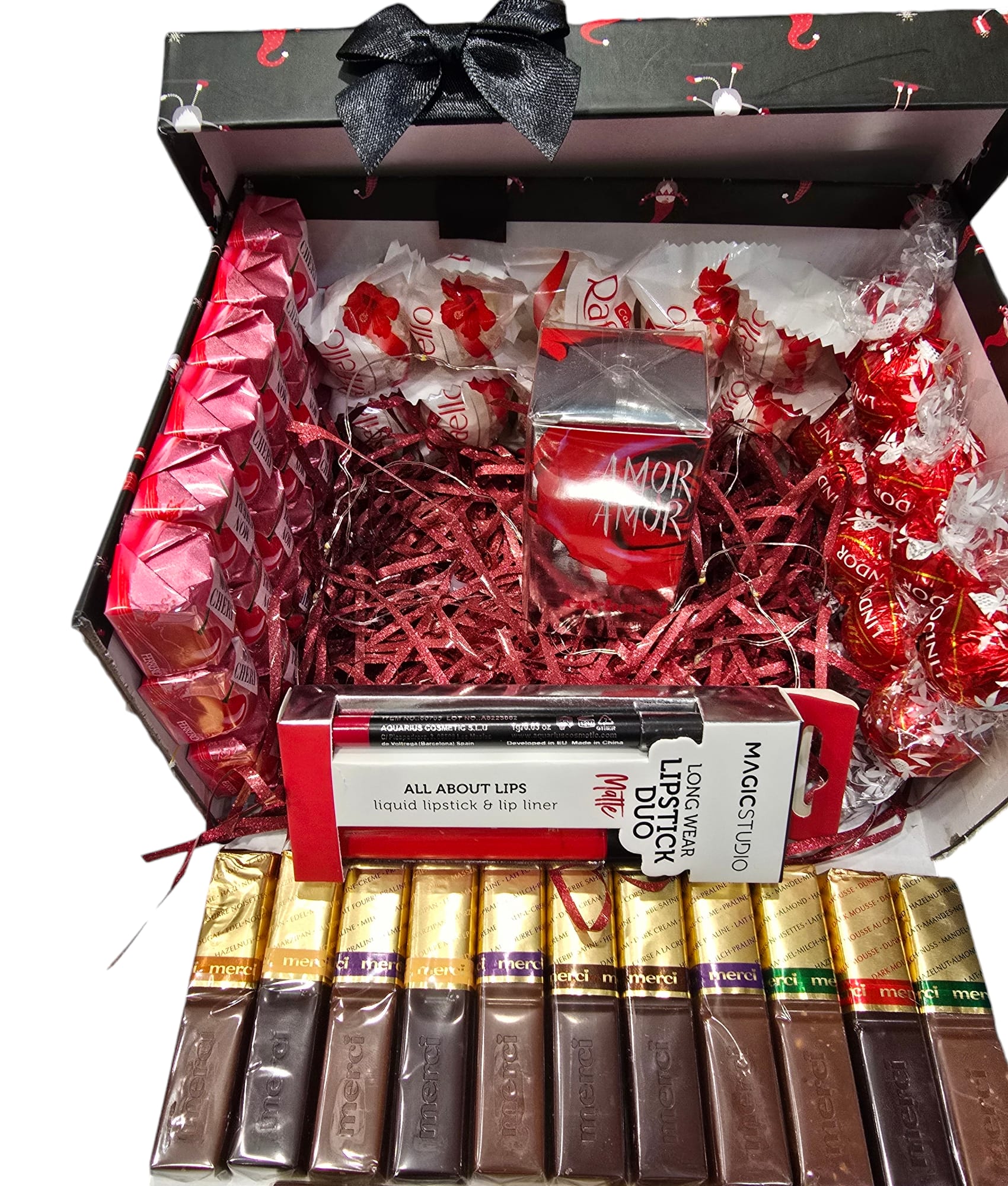 Una caja pensada para sorprender con dulzura y estilo. Incluye chocolates Merci, bombones Raffaello, perfume Amor Amor de Cacharel, labial dúo y envoltorio decorativo con lazos y papel en tonos rojo pasión. El detalle perfecto para regalar en San Valentín, aniversarios o simplemente para decir “me encantas”. Un mix irresistible entre sabor, belleza y amor.