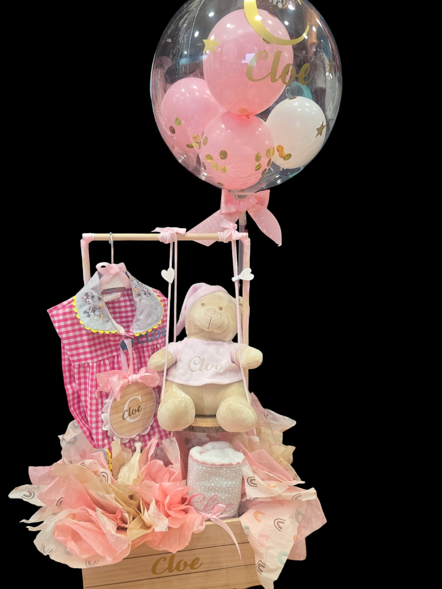 Un detalle único y lleno de amor para dar la bienvenida a una bebé especial. Incluye globo personalizado con nombre, peluche con babero a juego, conjunto de ropa infantil, pañalera y decoración floral en tonos rosa. Todo presentado en una caja de madera decorada con mimo. Ideal para nacimientos, bautizos o baby showers.