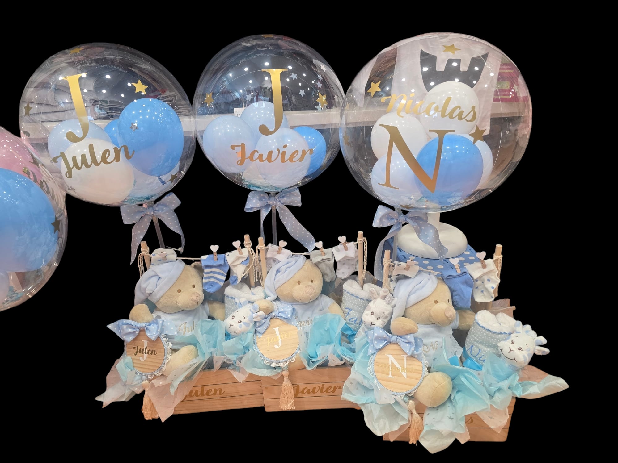 Canastilla de nacimiento personalizada con nombre, ideal para sorprender a los recién llegados. Incluye globo burbuja con inicial y decoración, peluche con mantita, ropa de primera puesta (bodys, patucos, gorrito), pañalera y detalles únicos. Presentada en una caja de madera decorada con mimo, lista para emocionar. Disponible con el nombre del bebé que elijas.
