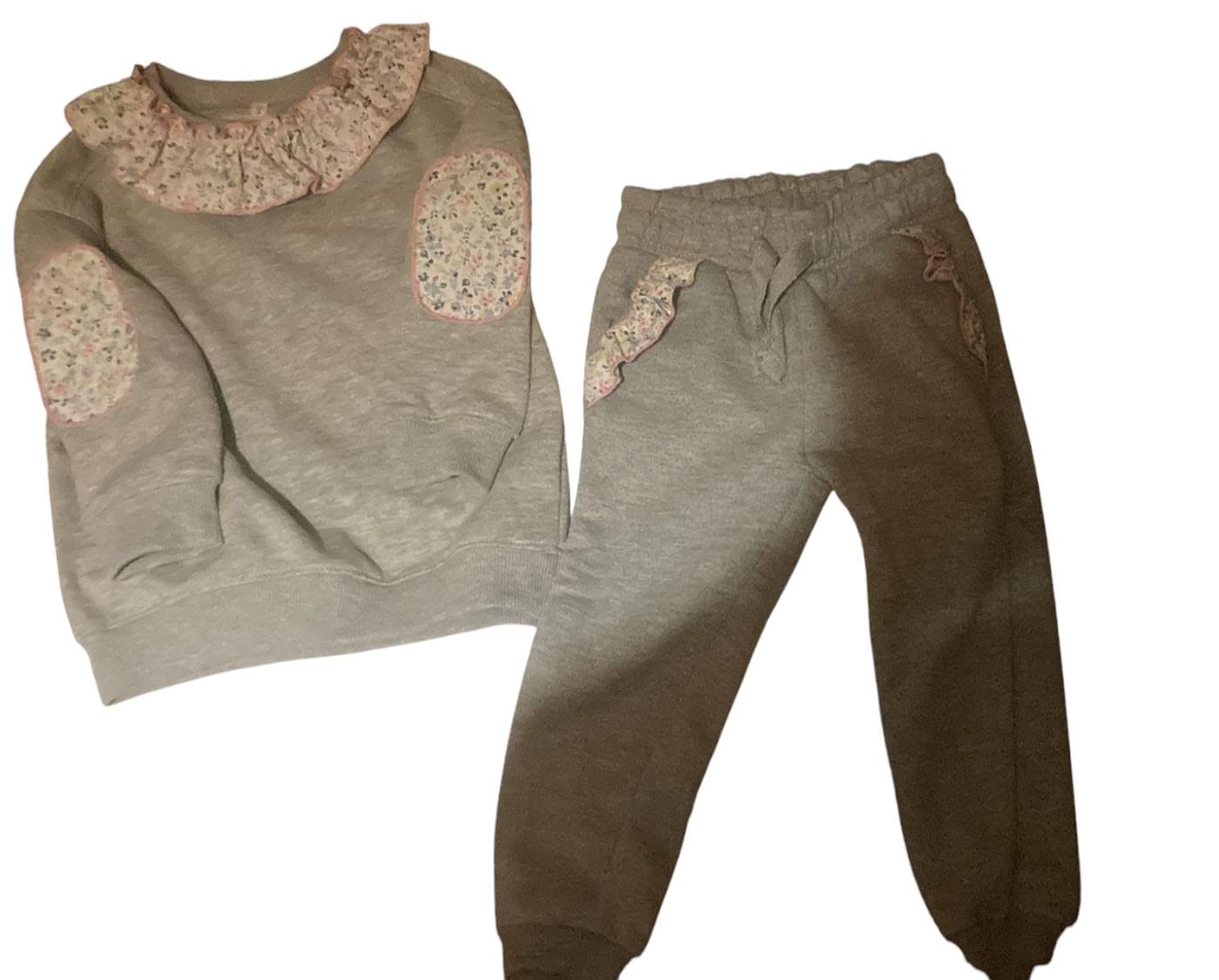 Conjunto de sudadera y pantalón largo en suave tono gris, decorado con detalles florales en cuello, coderas y bolsillos. El volante en el cuello y los pequeños toques de estampado añaden un aire dulce y coqueto, perfecto para que las peques estén cómodas sin perder el estilo. Ideal para entretiempo o días frescos.